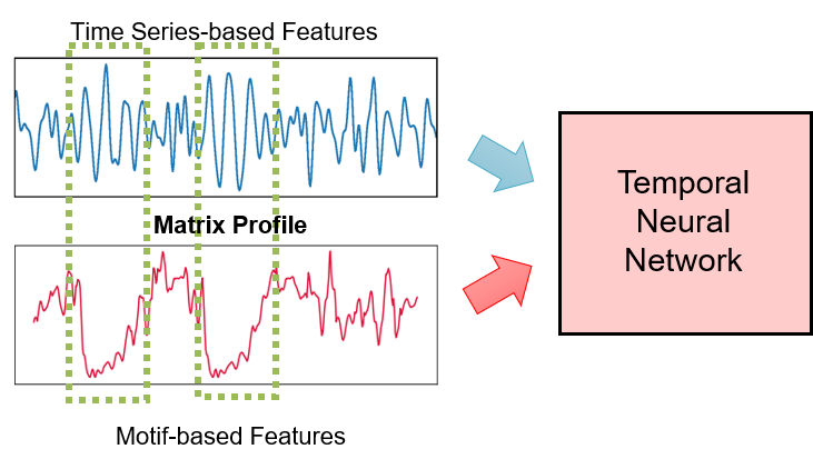 In this paper, we demonstrate that motif discovery, namely Matrix Profile, can be used as a feature to increase the accuracy of temporal neural networks.